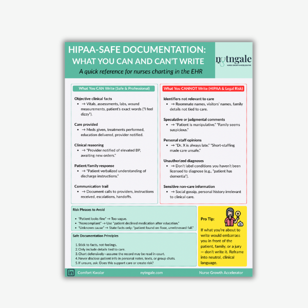 Practical cheat sheets, mini trainings, and documentation tools delivered every month—designed to help nurses, managers, and small clinics improve reporting, avoid legal risks, and save time. Created by nurses, for nurses.